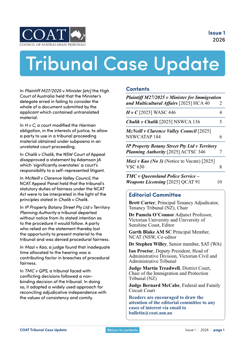 It is proposed that the cases to be included in the bulletin would be recent noteworthy or novel decisions relevant to tribunals and/or “tribunal craft”. They would include cases which reformulate, clarify or apply the general principles discussed in COAT’s Practice Manual for Tribunals. The Bulletin will include cases decided by the courts on review or appeal from a tribunal, together with first instance tribunal decisions and decisions from tribunal appeal divisions.